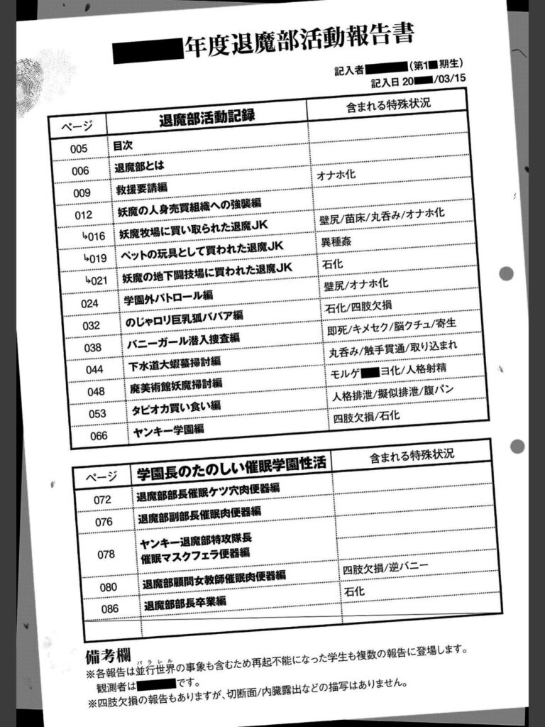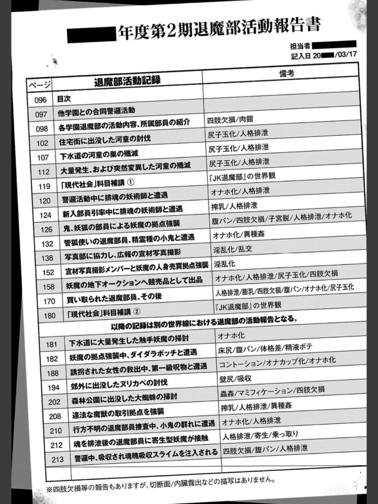 ダークハードファンタジーHが大人気の煌野一人オリジナル同人誌が書籍版で登場!魑魅魍魎はびこる現代において、魔に対抗する技を所持する退魔部女子校生たち。彼女たちは、怪異の苗床、石化しオナホ化、寄生され同胞の敵になるなど、人としての尊厳を踏みにじられ肉人…