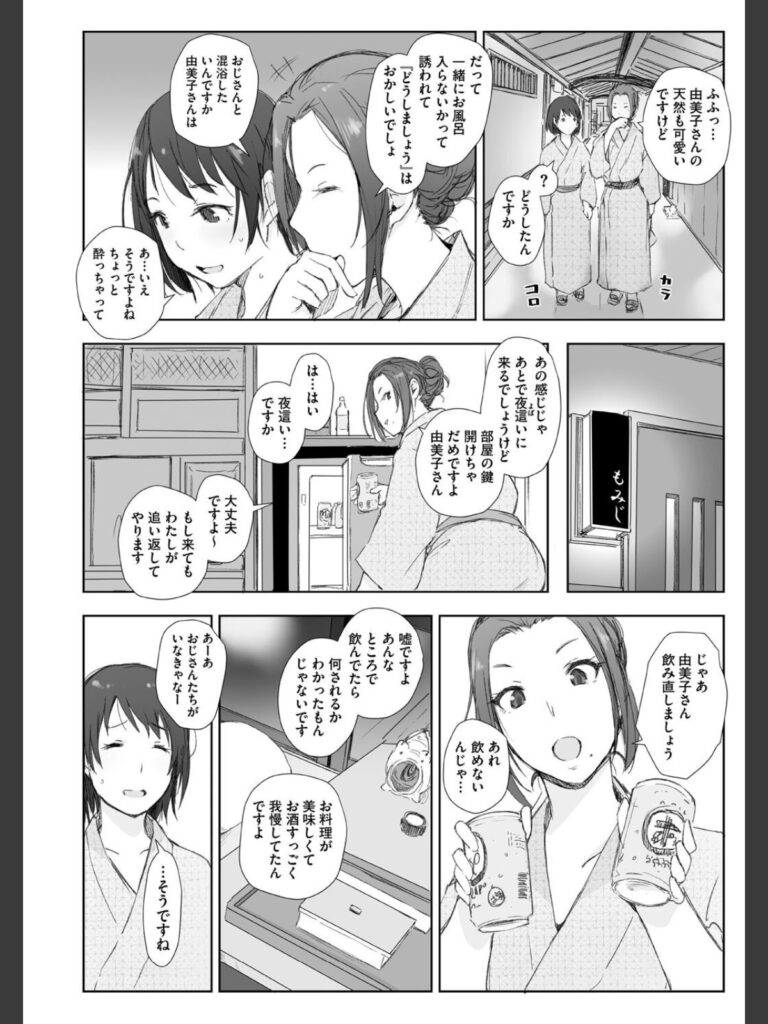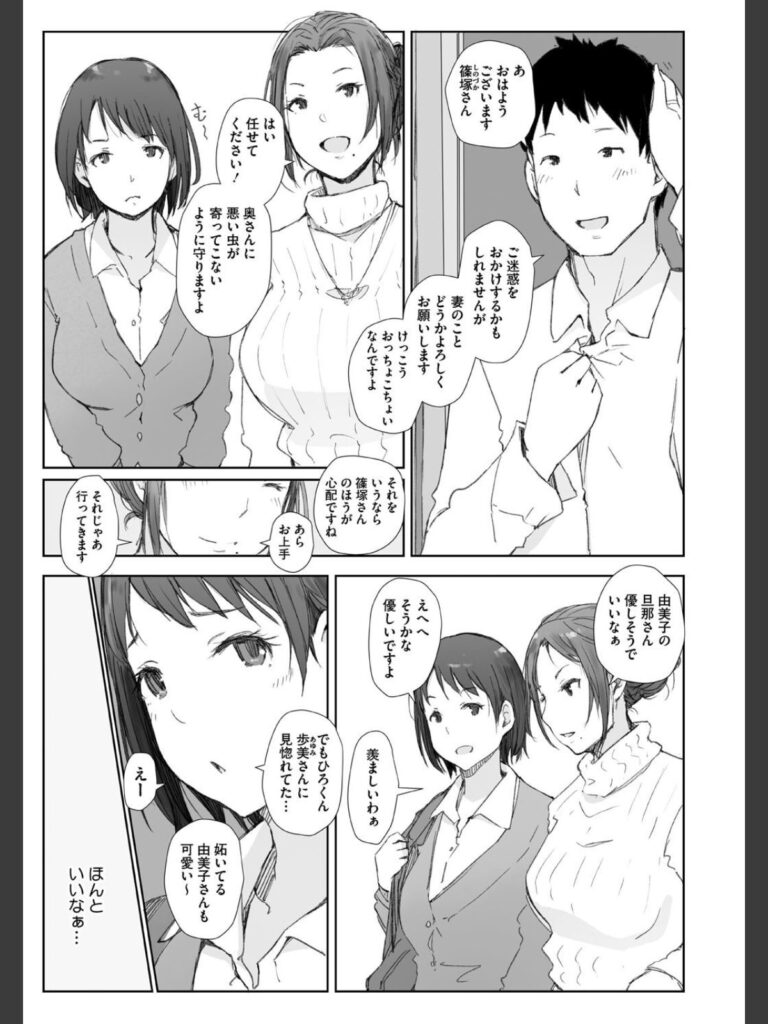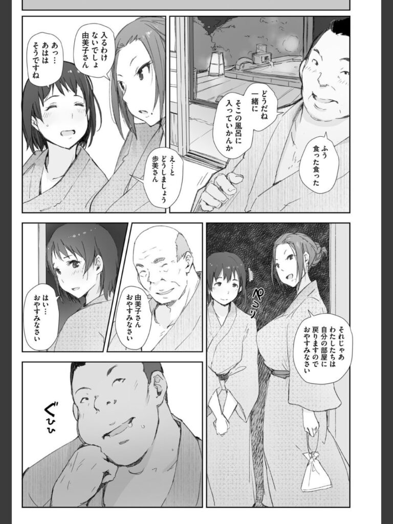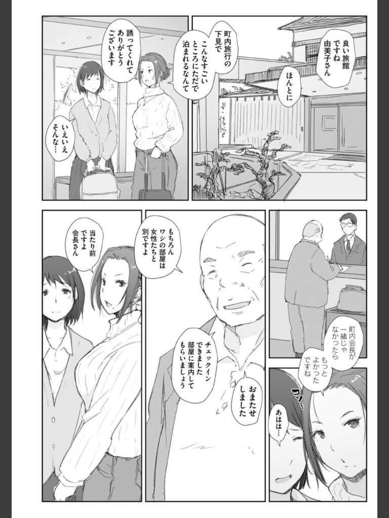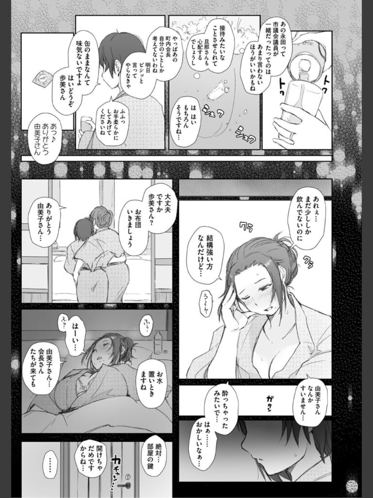 同行する町内会長になんとなく腹黒さを感じた歩美は、おっとりしている由美子は自分がまもらなければと決意をする。