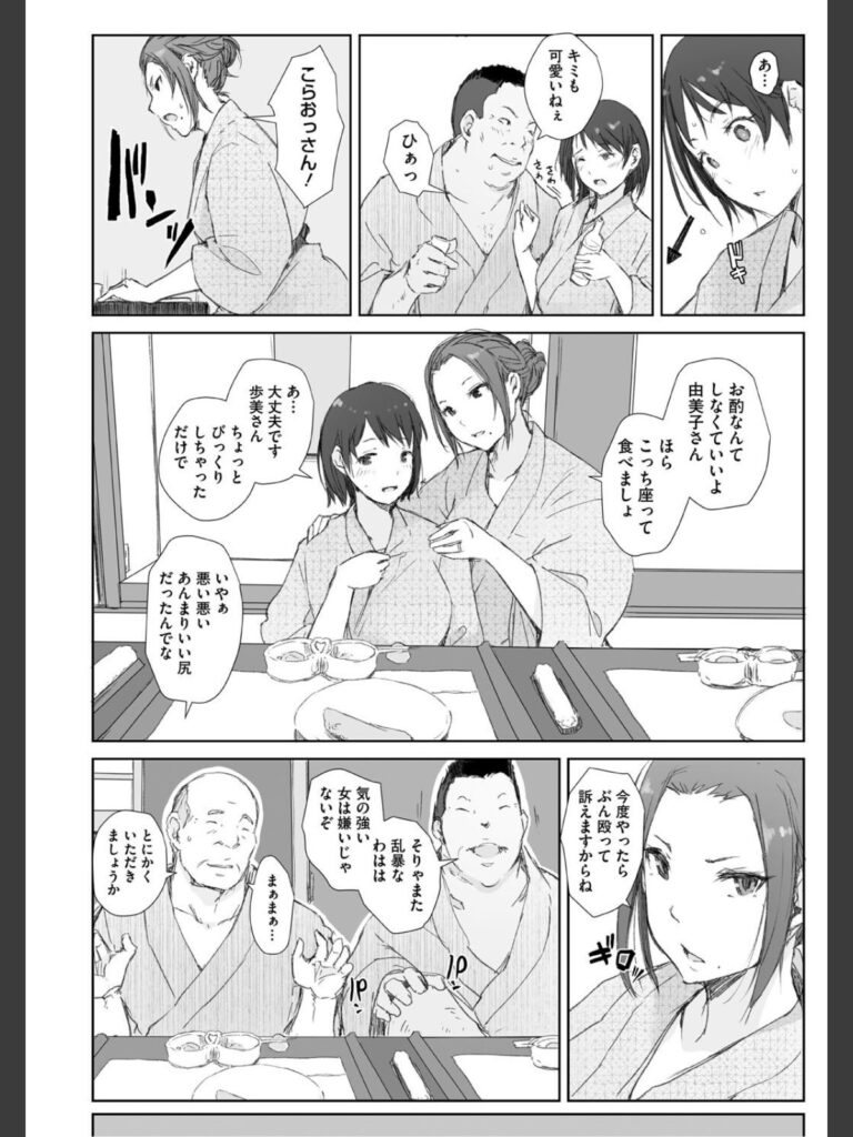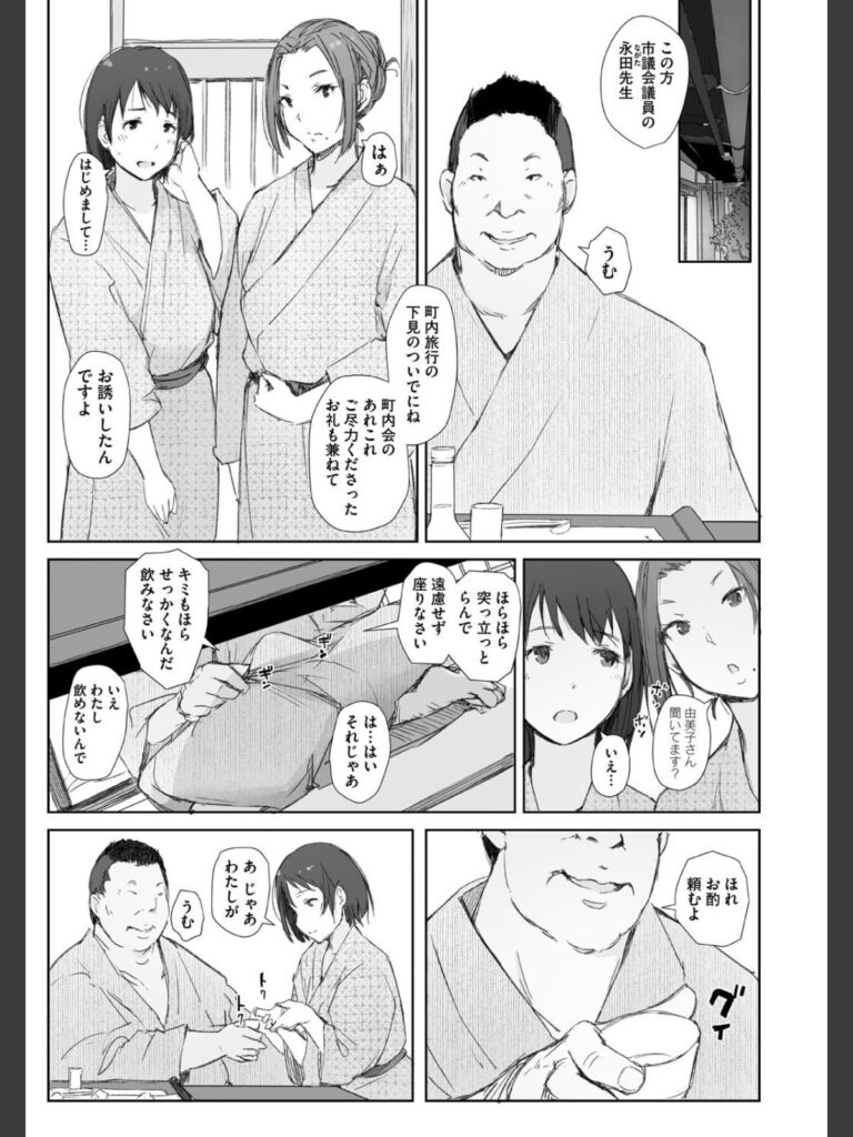 嫌な予感は的中するもので、晩御飯の席では、町内会長の紹介によると議員だといういかにもいやらしい目つきをした中年男が同席することになり…