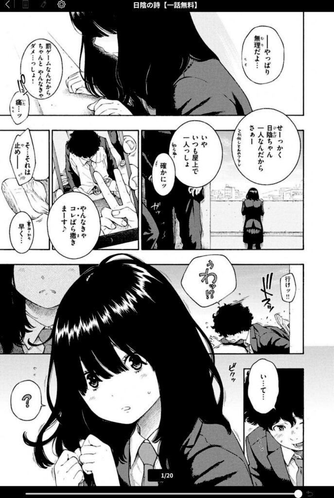 ’日陰ちゃん’と呼ばれる少女・一条ひなたは、罰ゲームで告白された影山のある頼みにうなずき、おずおずと股をひらく……。
