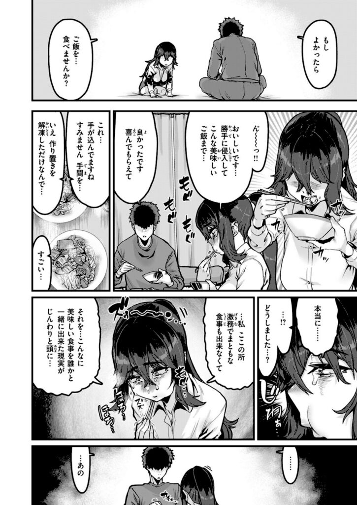 限界社畜の2人が傷もアソコも舐め合って乱れまくりベッドイン!?!?!?残業続きで意識も朦朧とする中帰宅する男・福田(ふくだ)。そして福田の家のドアに自分の家の鍵を突っ込もうとし続けている。コチラも残業続きで半ば意識が無く判断力も消え失せてしまった隣人の女・原沢(はらさわ)。「そこ…俺…