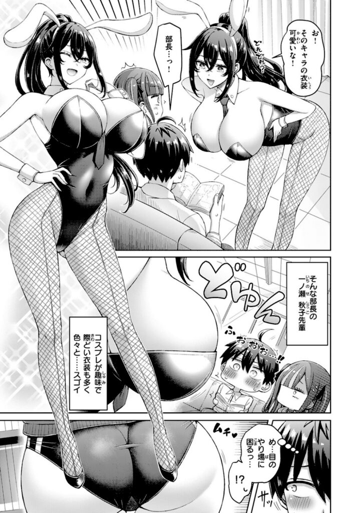 せめて趣味の合う部なら居場所が出来るかもと思い《二次元文化研究部》に入部したものの、距離感が近すぎる巨乳地雷系女子の杏奈(あんな)に、コスプレが趣味で平然とバニー衣装で過ごす部長の秋子(しゅうこ)先輩、常にブルマ姿で天然ボクっコな昔馴染みの彩羽(いろは)……と、個性の強すぎる女子たちに囲まれ、目のやり場に困る毎日を送っていた。