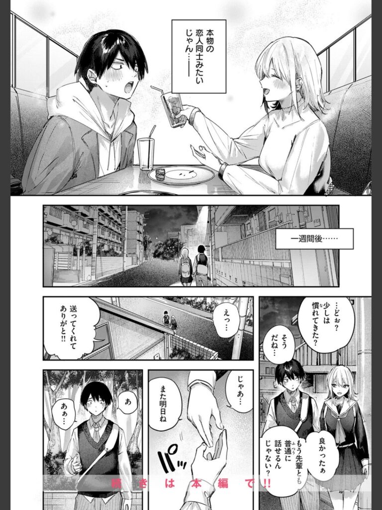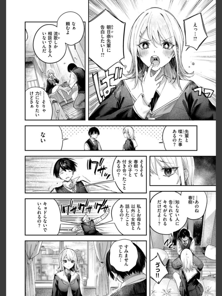 皆の憧れ・生徒会長の朝日奈(あさひな)先輩に告白するため、人懐っこくて周りから好かれている幼馴染の流歌(るか)に相談した俺。女のコと付き合ったことはおろか、ろくに喋ったこともない根暗な俺に、流歌は先輩と付き合えるように訓練してあげると言い出した。流歌に手を引かれるまま、放課後…